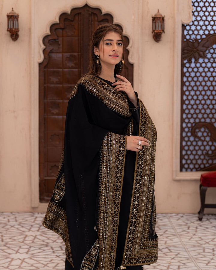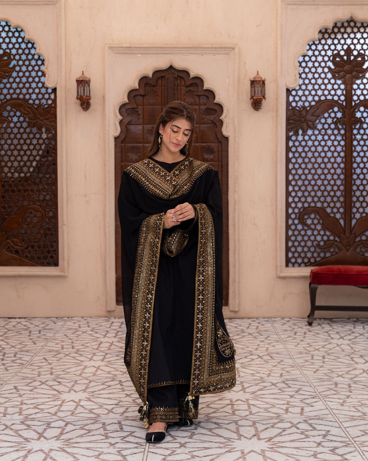 Black Mystique is a masterpiece of timeless design, featuring a full-sleeves long shirt adorned with intricate golden embroidery along the hem and neckline, creating a stunning contrast against the rich black fabric. The straight trousers are tailored to perfection, with delicate embellishments that harmonize beautifully with the ensemble, making Black Mystique an embodiment of elegance and allure.