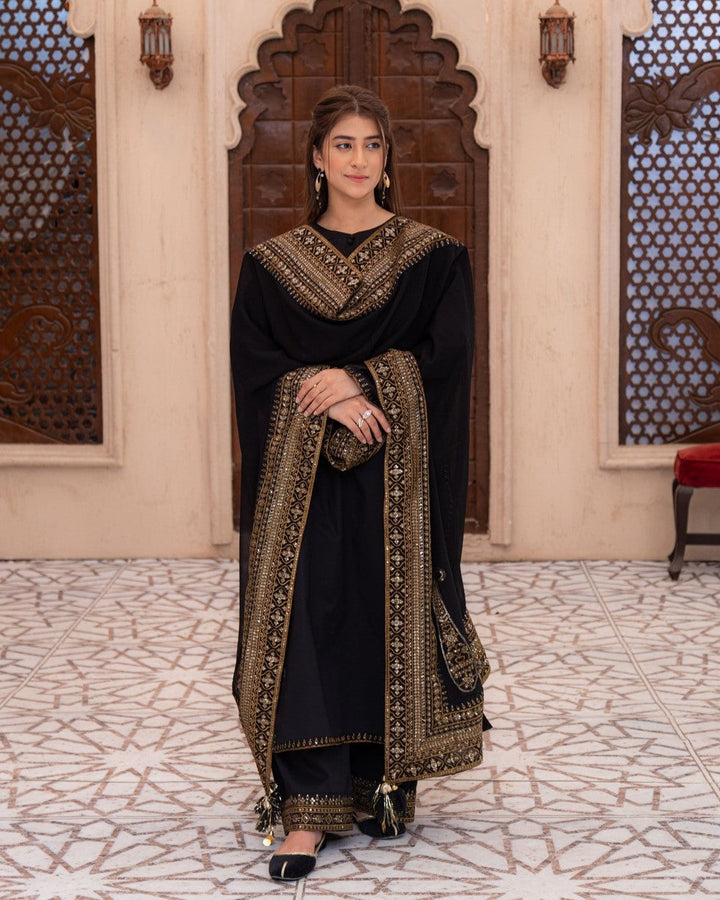 Unveil the allure of elegance with Black Mystique, a 3-piece suit designed for women who embrace sophistication and charm. This exquisite ensemble in luxurious black Premium Lawn exudes a captivating mystique, perfect for evening soirees, formal events, or festive celebrations.