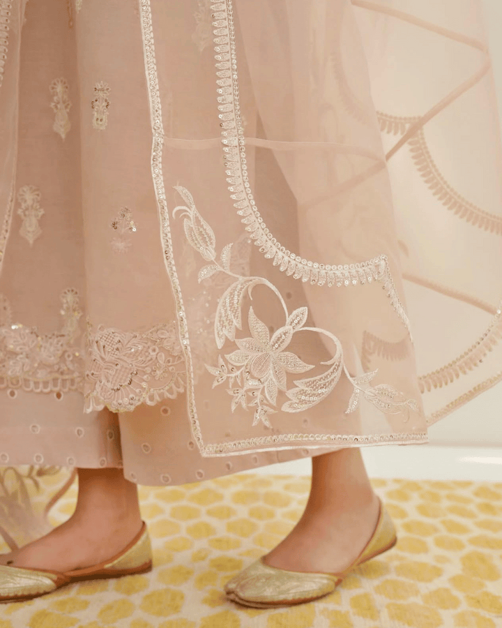 Adding a layer of airy elegance is the organza dupatta, beautifully embellished with floral embroidery and subtle detailing. Its sheer texture and delicate finish add a dreamy, ethereal touch, making the outfit effortlessly stylish and regal. Whether draped traditionally or styled with a modern twist, the dupatta completes the look with poise.
