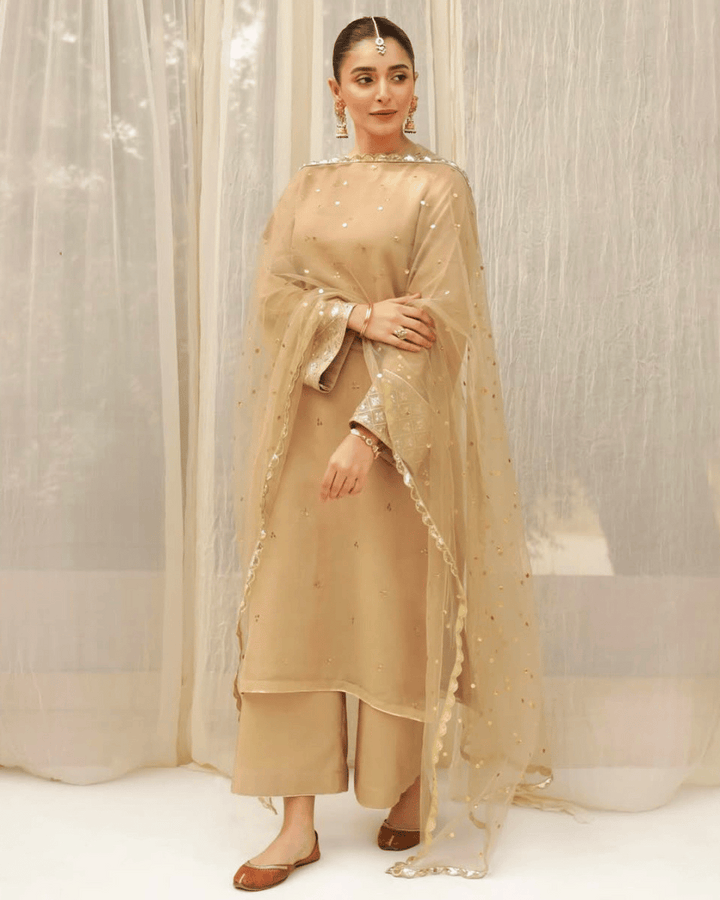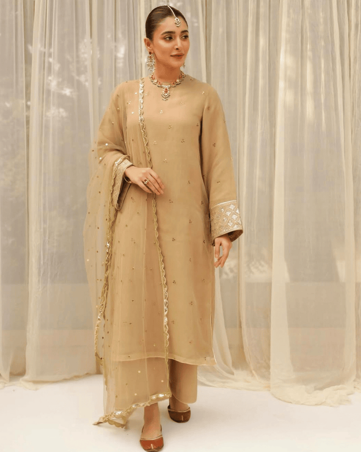 What truly elevates this outfit is the embroidered organza dupatta. Light and airy yet structured enough to hold its shape, the dupatta is embellished with delicate embroidery and shimmering sequins, creating a subtle sparkle that catches the light beautifully. This adds a regal flair to the overall look, making it ideal for both daytime functions and evening events.