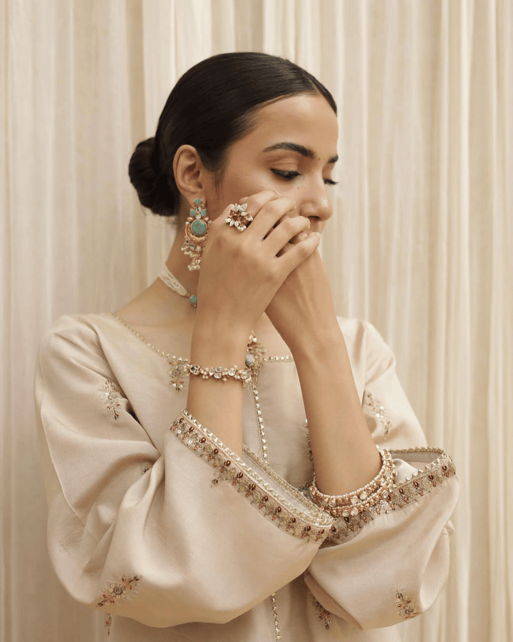 The shirt features delicate golden embellishments and refined embroidery, creating a look that’s both regal and understated. The detailing is artfully done to highlight the natural silhouette while maintaining a graceful, soft presence. Its subtle shimmer and fine craftsmanship reflect a commitment to elegance that never fades.