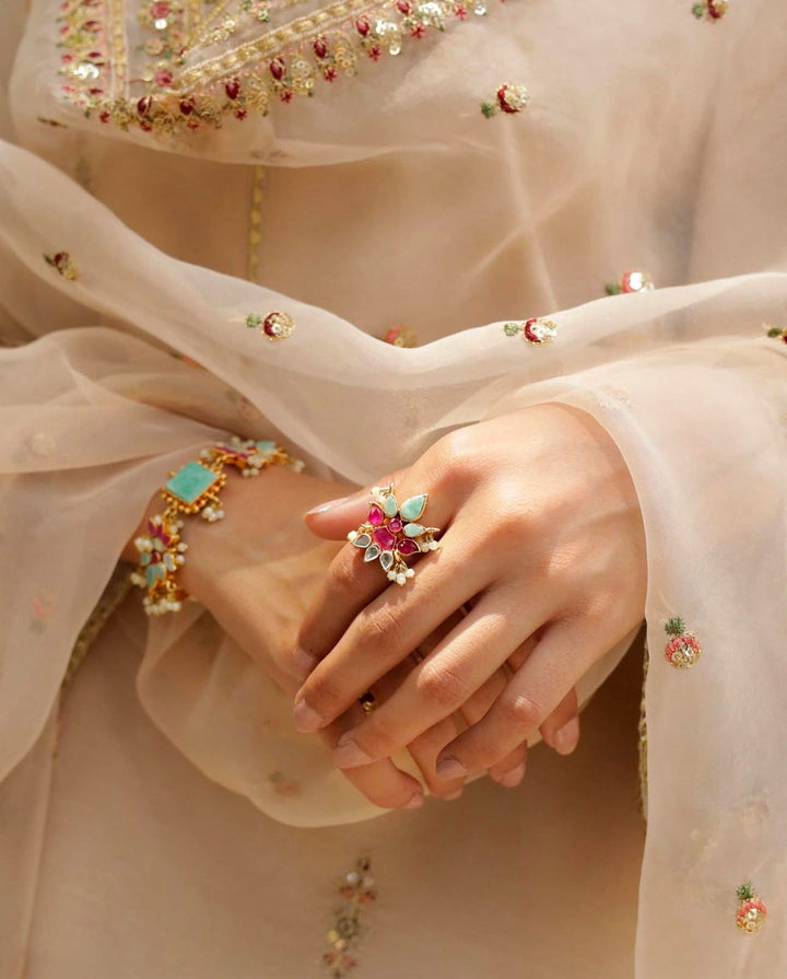 Completing this exquisite look is the organza dupatta, the highlight of the ensemble. Adorned with intricate patterns and a shimmering border, the dupatta adds an ethereal layer to the outfit. Its lightweight, sheer texture brings balance to the rich embroidery of the shirt, creating a perfectly harmonious design.