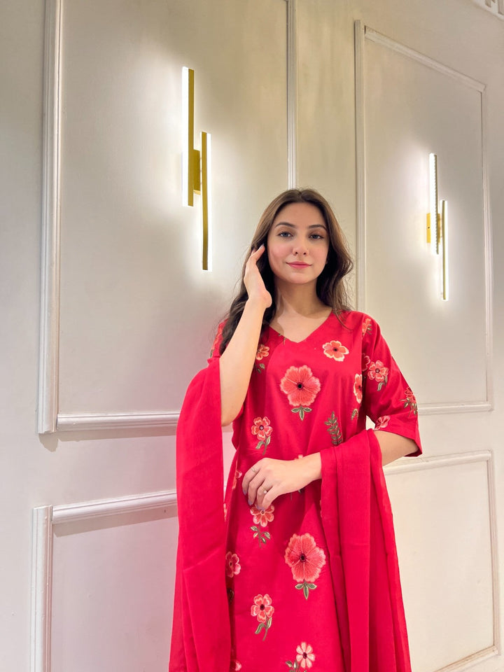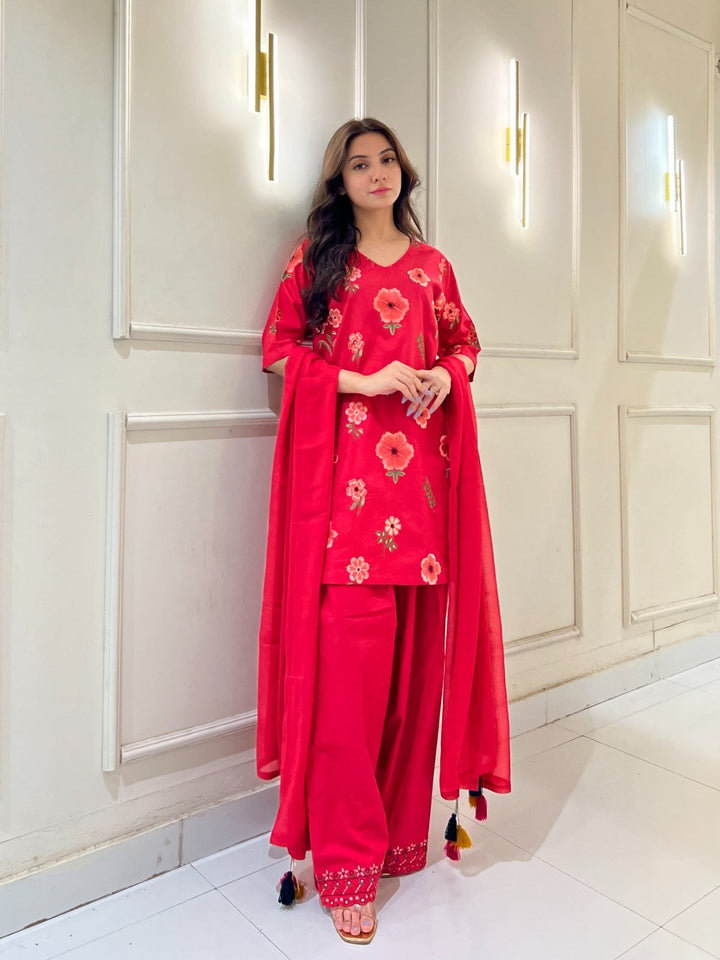 The Gulaabo is a radiant and vibrant 3-piece stitched outfit, designed to captivate with its striking ruby shocking pink hue. This ensemble celebrates the beauty of spring with intricate red and...