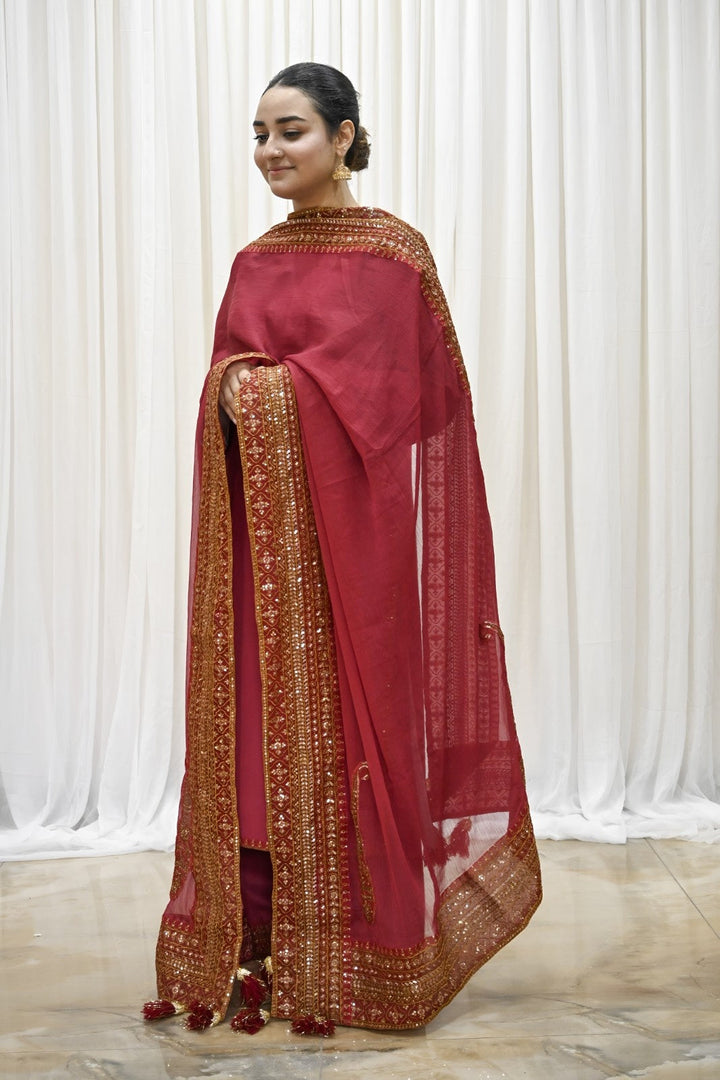 What truly elevates Mahroon Mystique is its striking chiffon dupatta. Light and sheer, it flows effortlessly while its heavy embroidered borders and mirror detailing add a stunning sparkle with every step. Finishing touches like playful tassels at the edges bring movement and charm without going over the top. Paired with a matching trouser adorned with coordinating embroidery, the complete outfit is a harmonious blend of boldness and beauty.