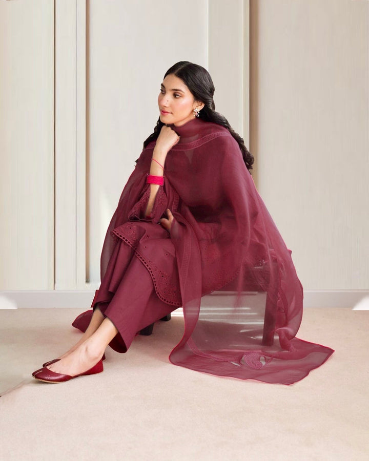 The Maroon Elegance is designed in a deep maroon shade and adorned with delicate tone-on-tone embroidery along the neckline, sleeves, and borders. The craftsmanship reflects a perfect balance of minimalism and classic charm, allowing the rich fabric and detailed patterns to speak for themselves. The long-length kurta flows gracefully, offering a modest yet stylish silhouette suitable for women of all ages.
