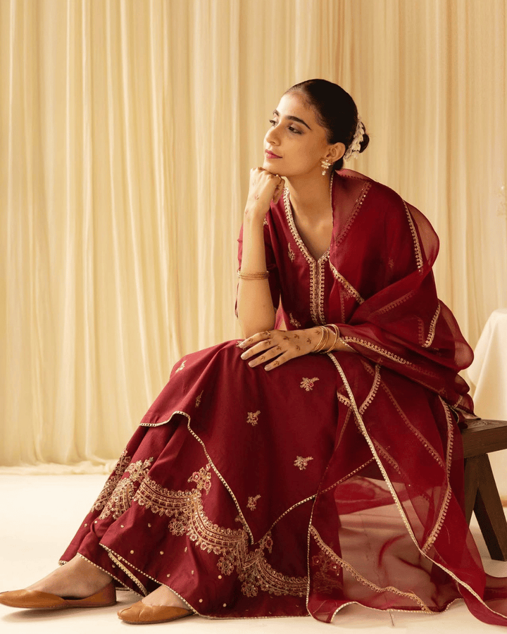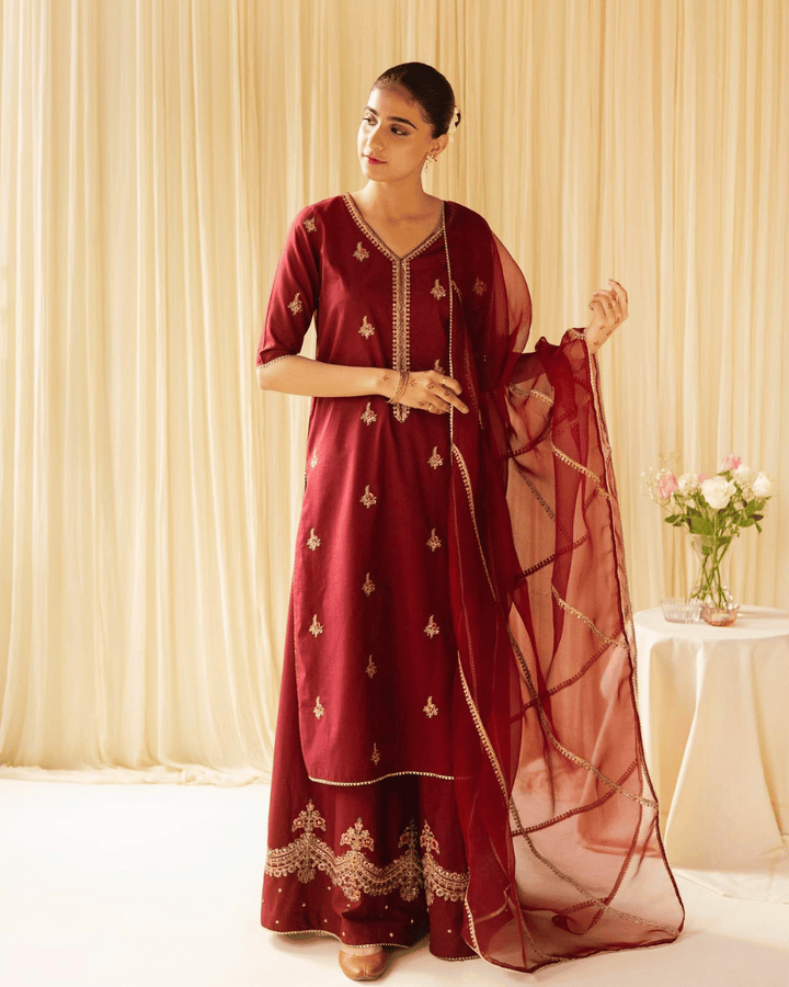 The rich, deep maroon kurta is the centerpiece of this ensemble, adorned with delicate golden embroidery that adds a regal flair. A flattering V-neckline paired with intricate embellishments offers the perfect balance between elegance and subtle glamour. The sleeves and borders are enhanced with thoughtful details that highlight the outfit’s luxurious craftsmanship.The matching trousers feature embroidered hemline accents, creating a cohesive and polished silhouette.nza dupatta, edged with soft golden borders that glisten subtly in the light. Light, flowing, and graceful, the dupatta brings an ethereal beauty to the overall outfit, tying the entire look together.