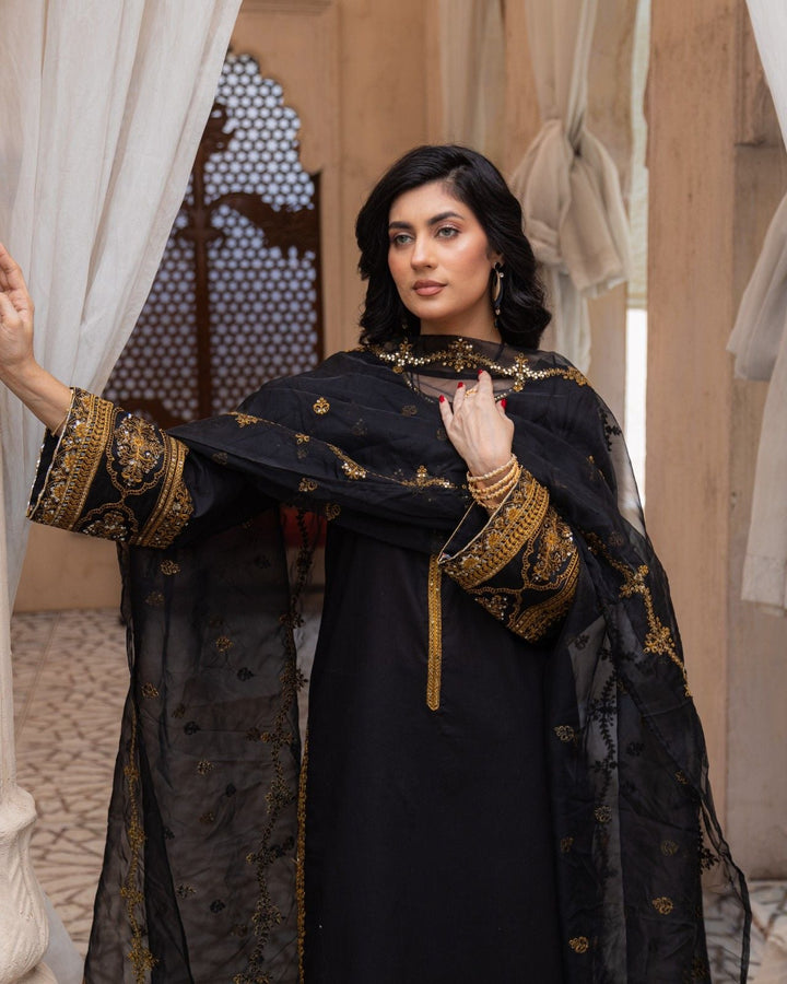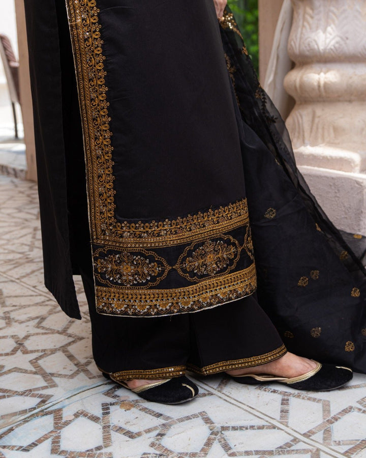 The shirt and trousers are made from premium lawn fabric, offering a lightweight yet polished look. Known for its comfort and breathability, the lawn fabric ensures ease of movement while maintaining a sharp silhouette. The classic black color lends a rich, versatile base that enhances the elegance of the entire outfit.